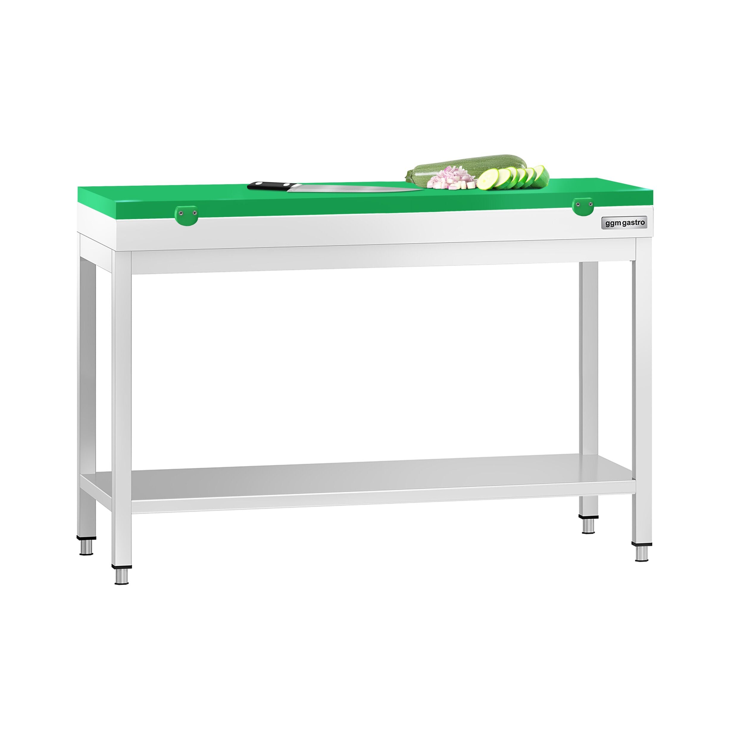 Stålbord i rustfrit PREMIUM - 2,0 m - med underhylde - inkl. skærebræt i grønt