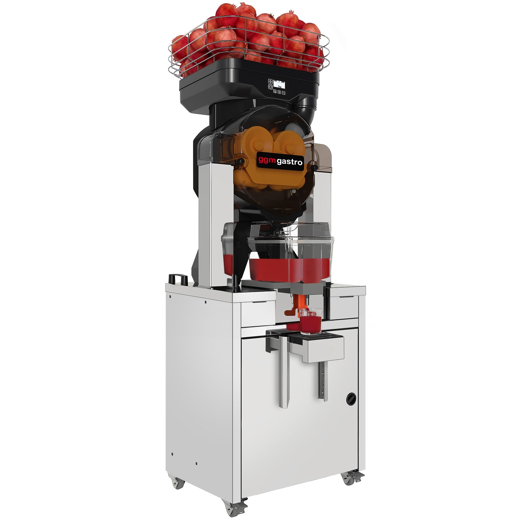Elektrische Orangenpresse - Orange - mit Saftspeicher (mit Kühlung), Reinigungsmodus, Ablasshahn & Untergestell