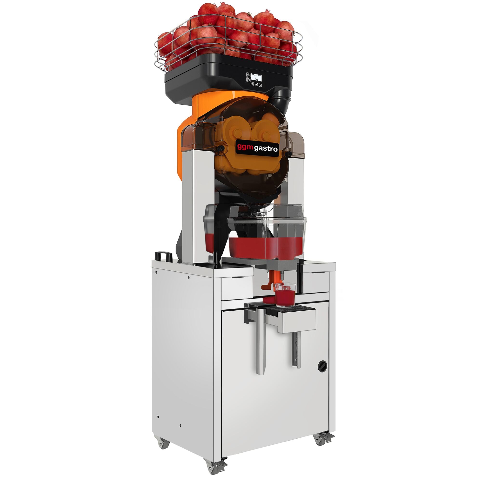 Elektrische Orangenpresse - Orange - mit Saftspeicher (mit Kühlung), Reinigungsmodus, Ablasshahn & Untergestell
