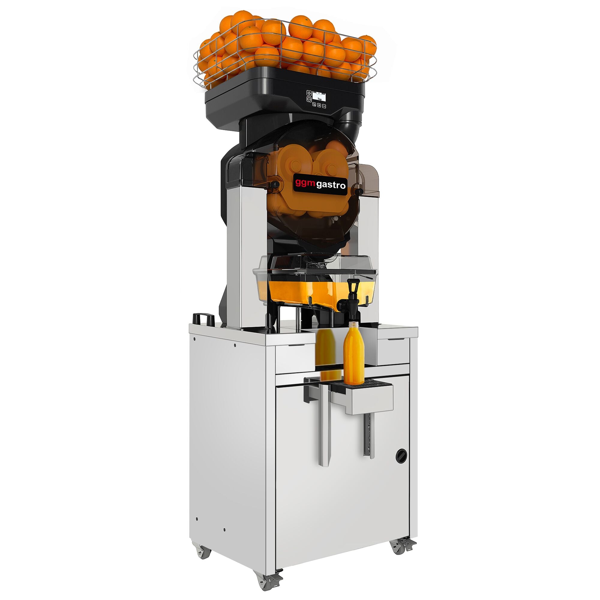 Elektrische Orangenpresse - Silber - mit Saftspeicher (ohne Kühlung), Reinigungsmodus, Ablasshahn & Untergestell