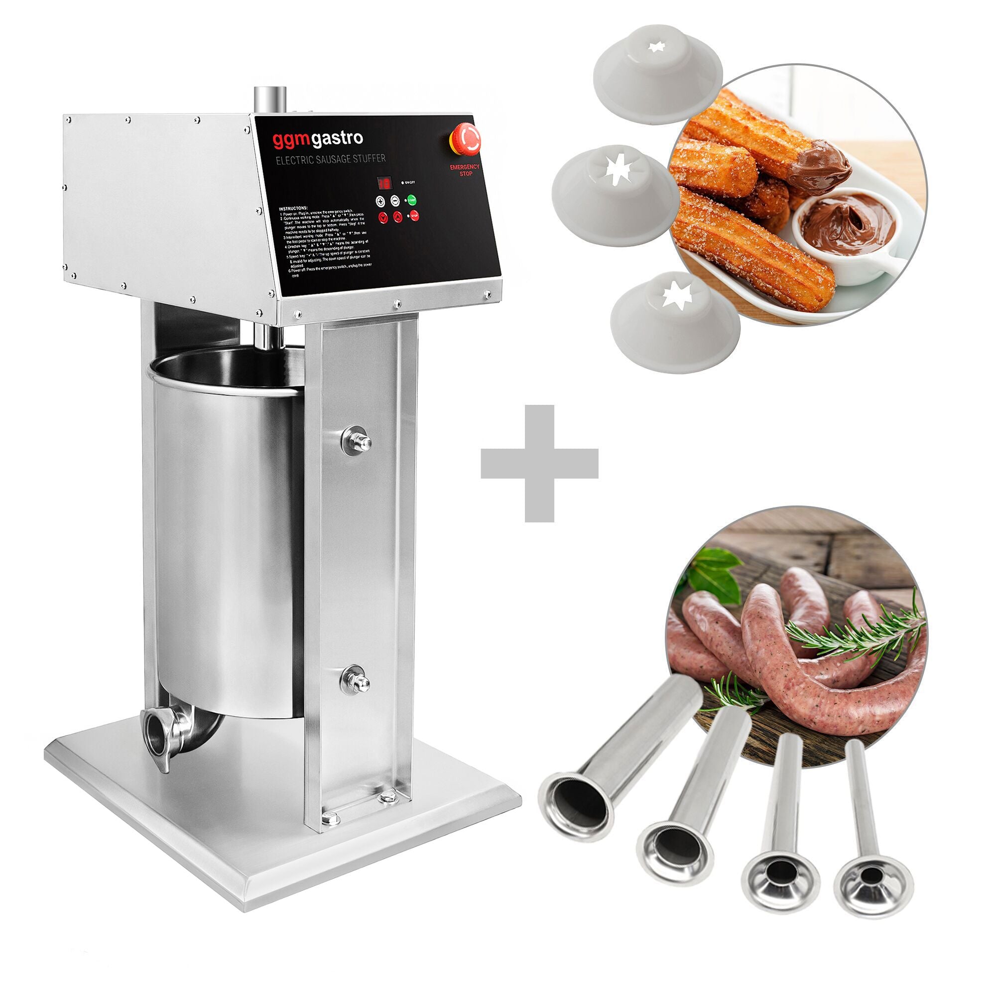 Elektrisk pølsestopper & churro-maskine - 25 Liter - 180 watt - rustfrit stål - inkl. 3 pølsestoppere & 3 churro-tilbehør