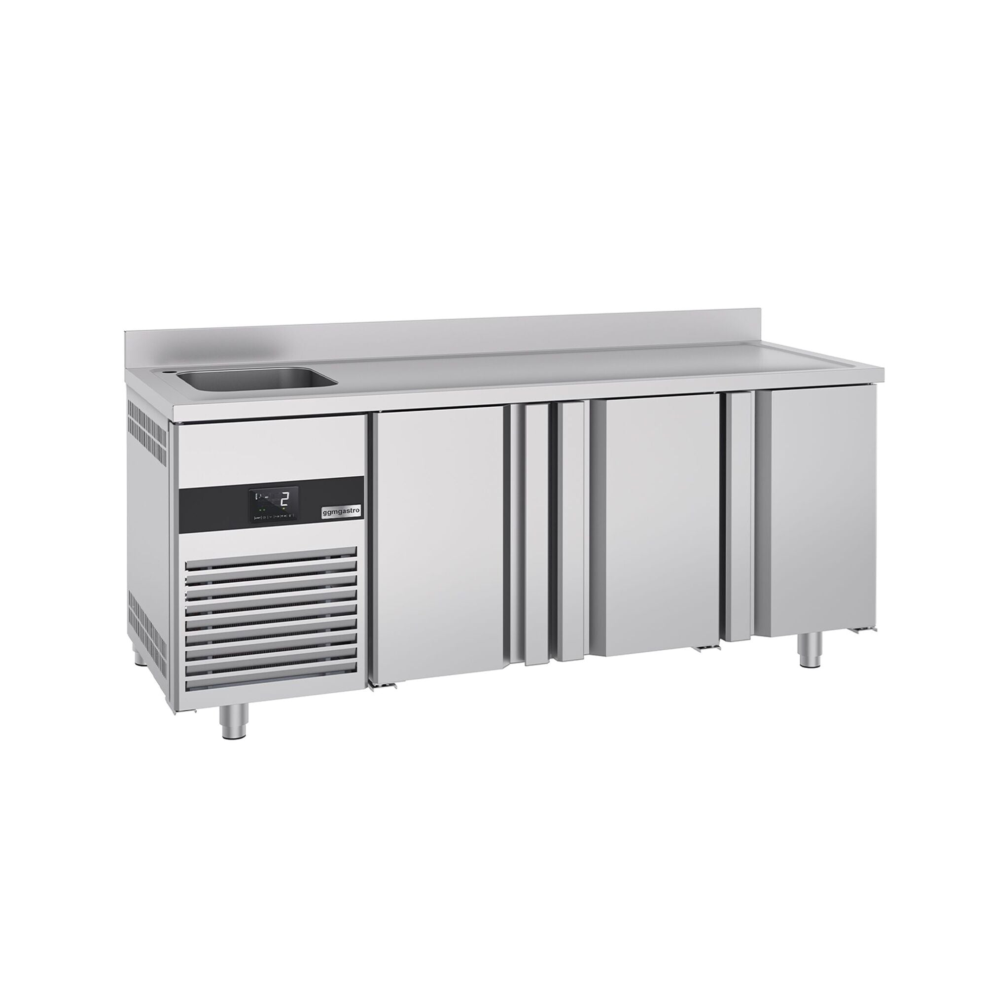 Kølebord - 1,9 x 0,7 m - med 3 Døre, 1 Vask i Venstre Side og Bagkant - 420 Liter