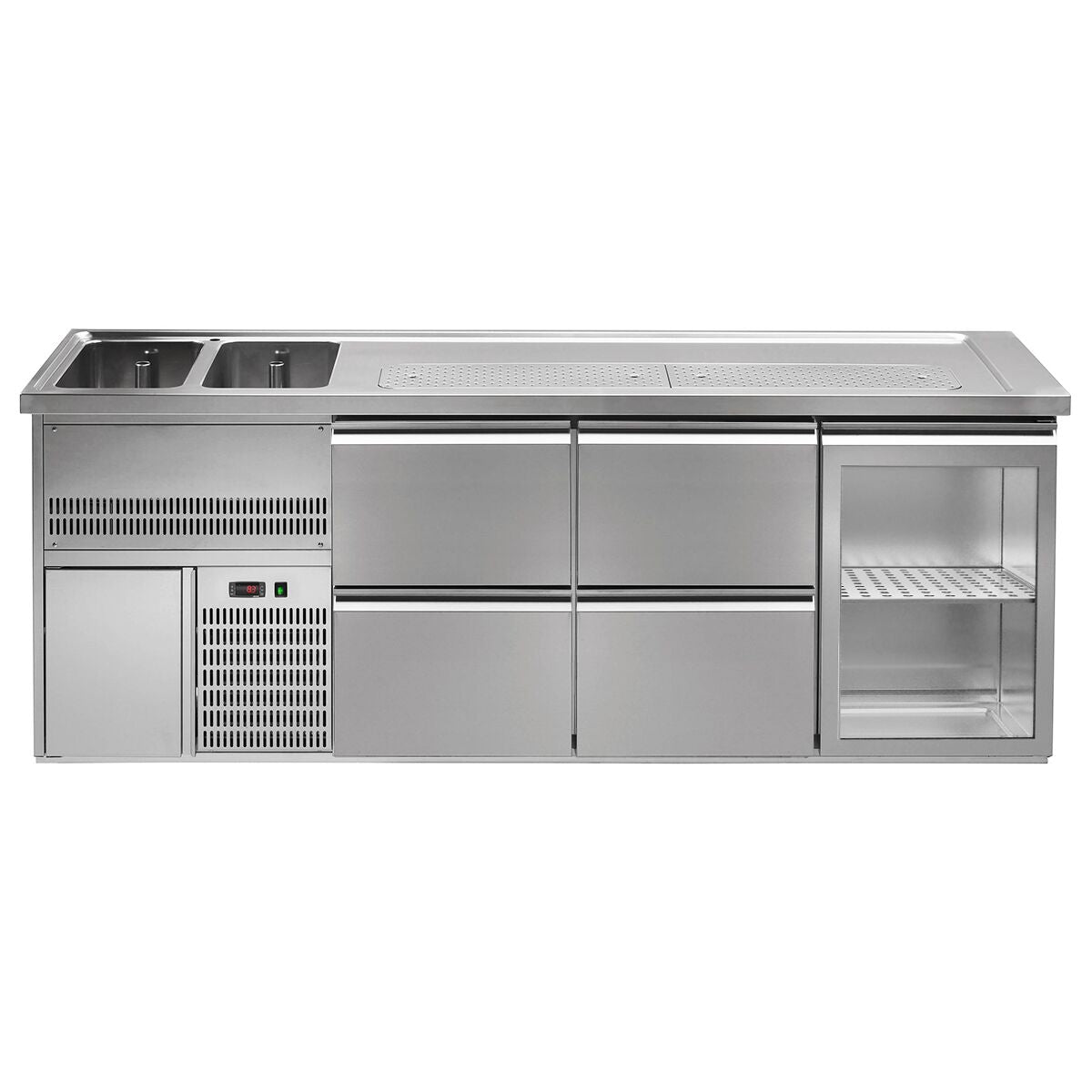 Øldisk Premium PLUS - 2,5 x 0,7 m - med 1 glasdør og 4 skuffer 1/2 + 1/2