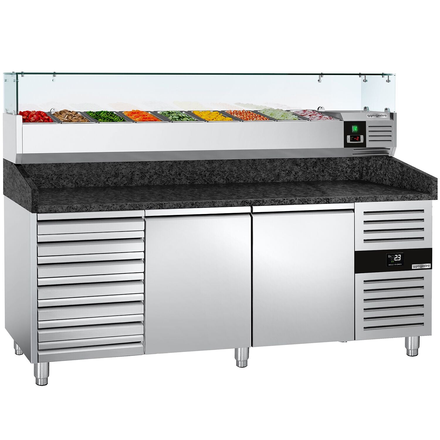 Pizzabord PREMIUM 2,0 x 0,8 m - med 2 Døre og 7 Neutrale Skuffer - inkl. Køleopsats - 9x GN 1/3