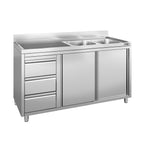 Køkkenvask stål - med underskab - med 3 skuffer - 1,6m - 2 vaske til højre - med bagkant og dobbelte døre