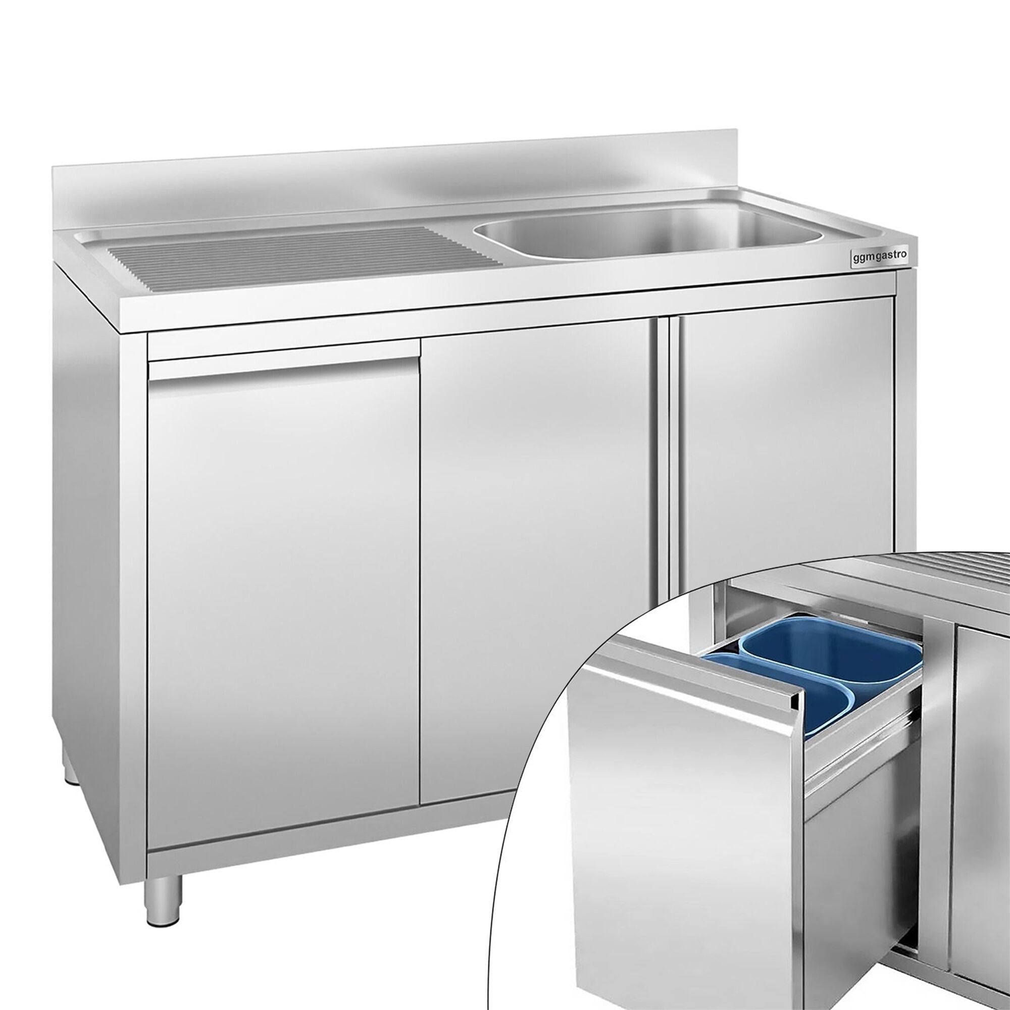 Køkkenvask stål - med underskab - med skraldespand - 1,2m - 1 vask til højre - med bagkant og dobbelte døre