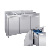 Køkkenvask stål - med underskab - med skraldespand - 1.6m - 2 vaske til venstre - med bagkant og dobbelte døre